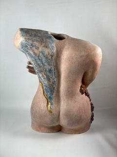 Encaustic, involves applying layers of hot, sometimes pigmented beeswax onto a unglazed, fired surface. The wax gives the clay a depth, sheen, and skin like feel that invites a person to touch or stroke the sculpture. Since my subject is representation of human forms, I like the interaction encaustic surfaces encourages between the viewer and the piece.